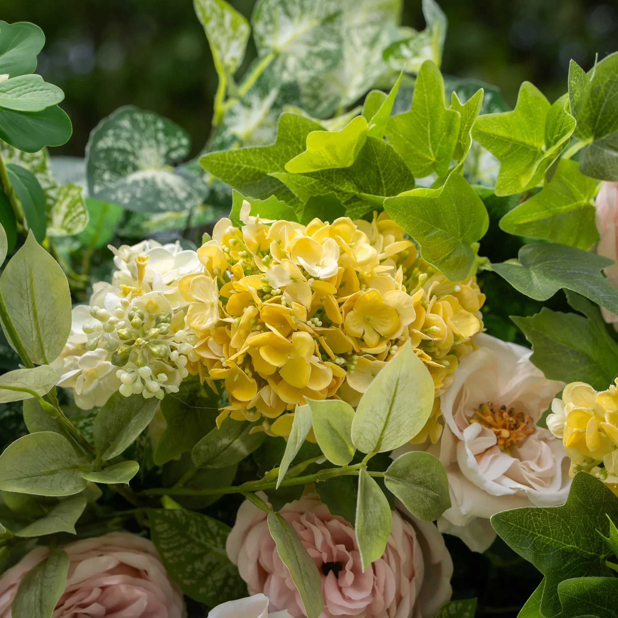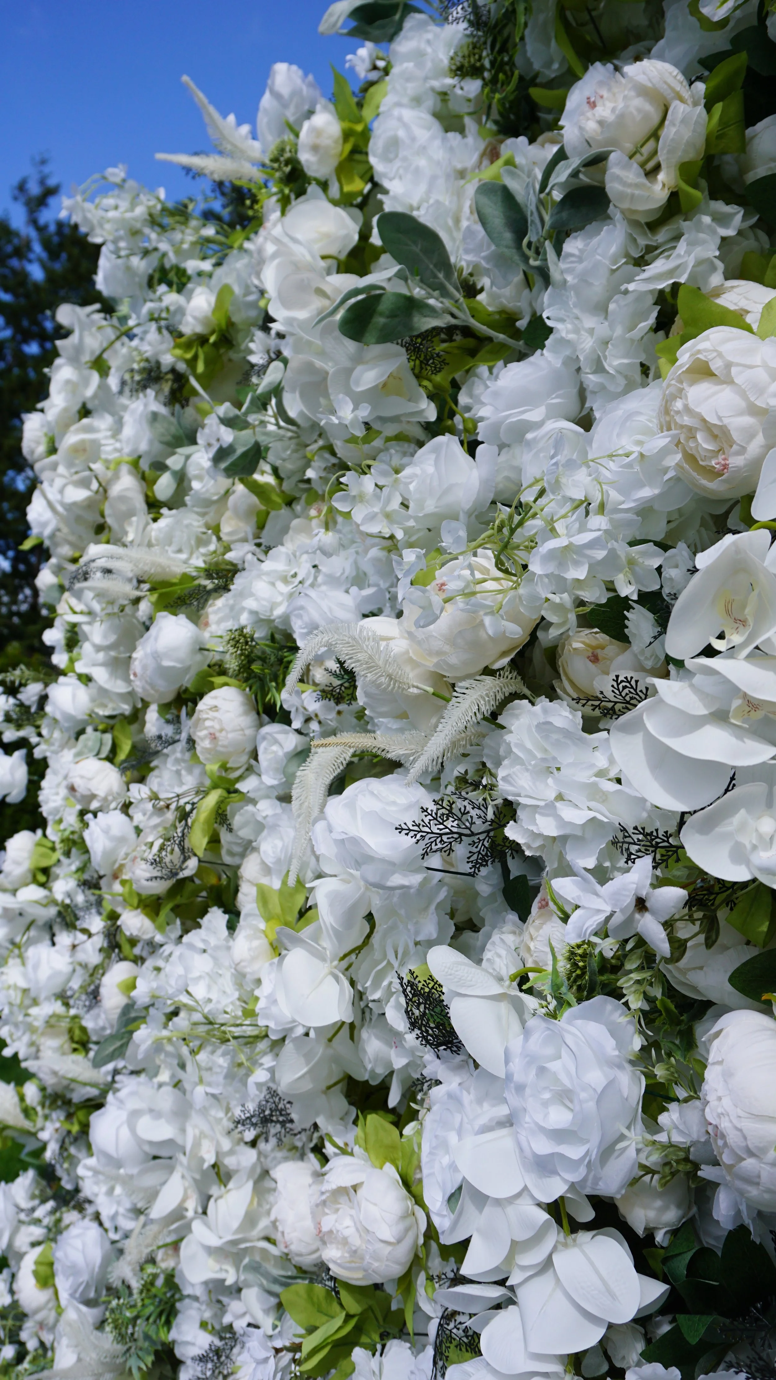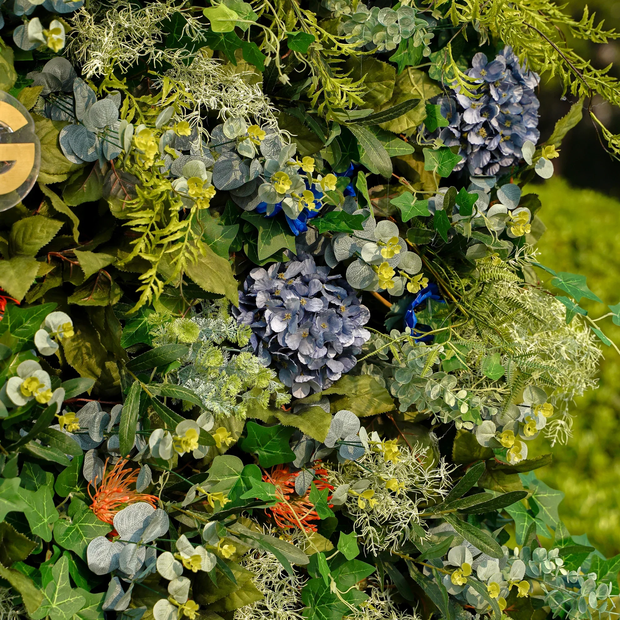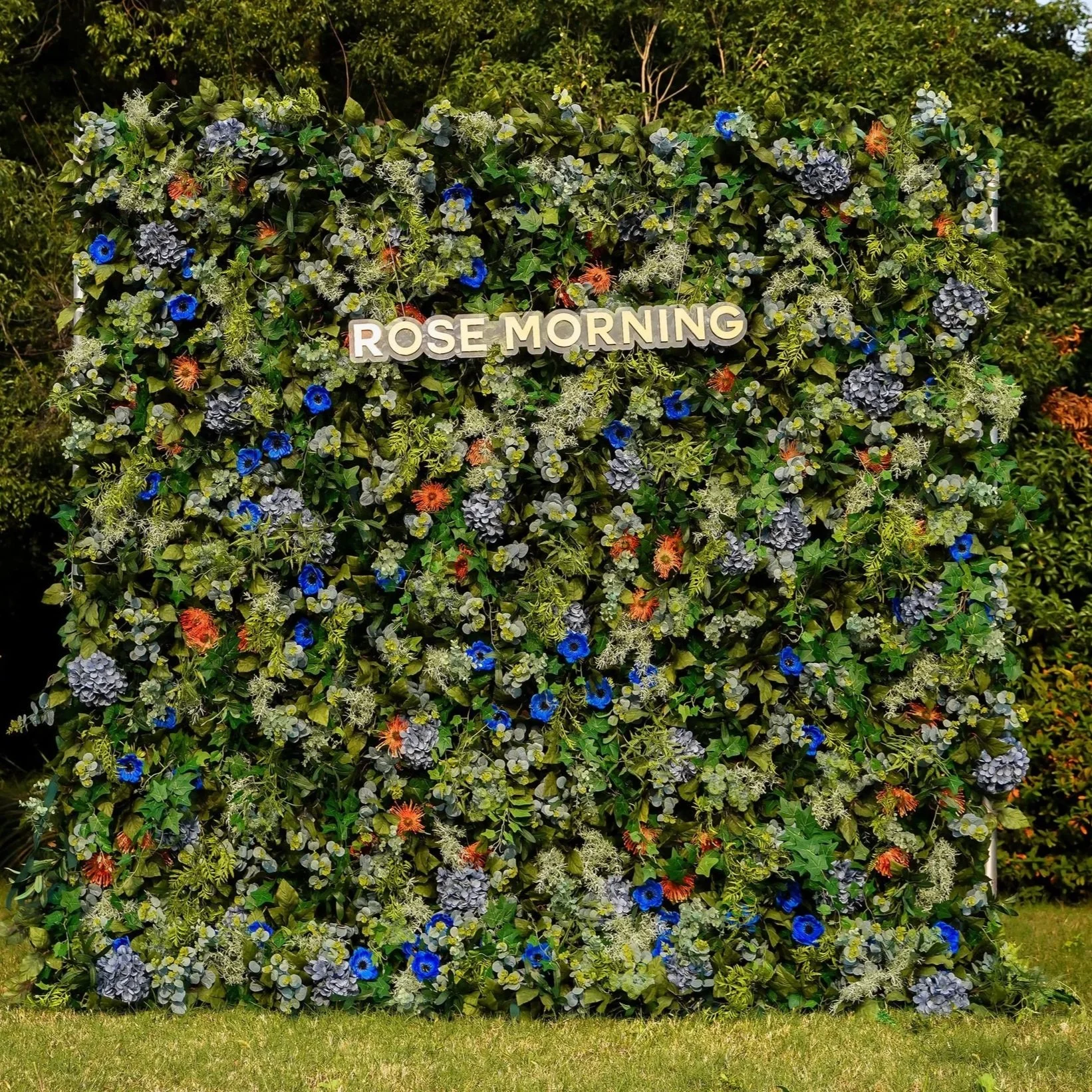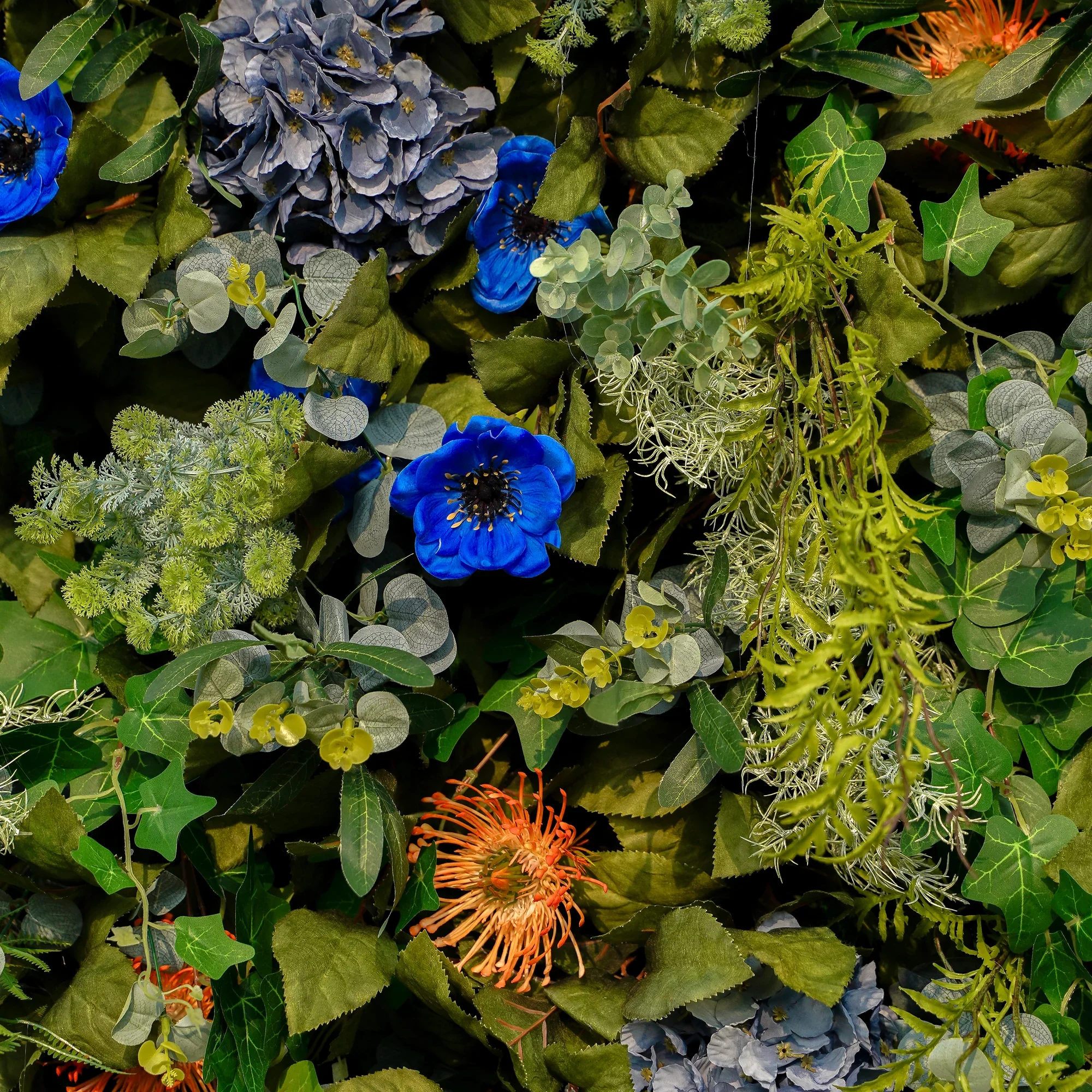 This is a vibrant statement piece bursting with deep blue hydrangeas, soft greenery and warm accents. It's lush texture and rich contrast bring life to any space – perfect for baby showers, corporate events and outdoor celebrations.